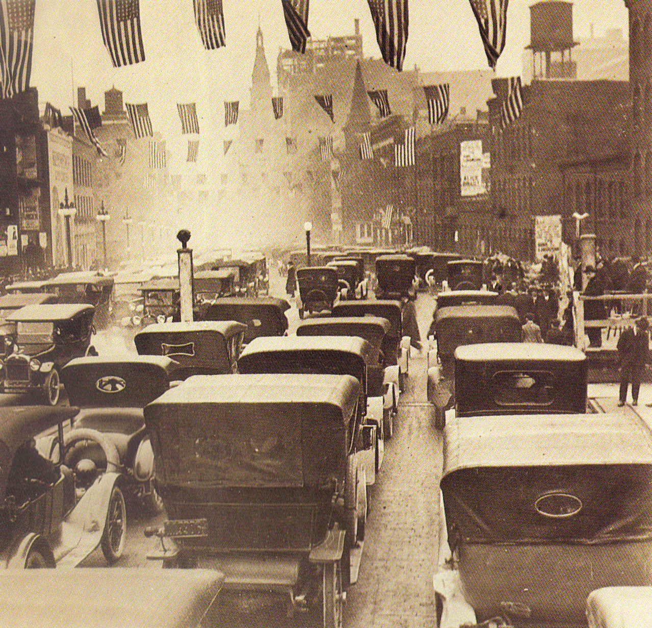 Period photo of Chicago, Illinois, traffic on May 17, 1920 at northside of Michigan Avenue Bridge