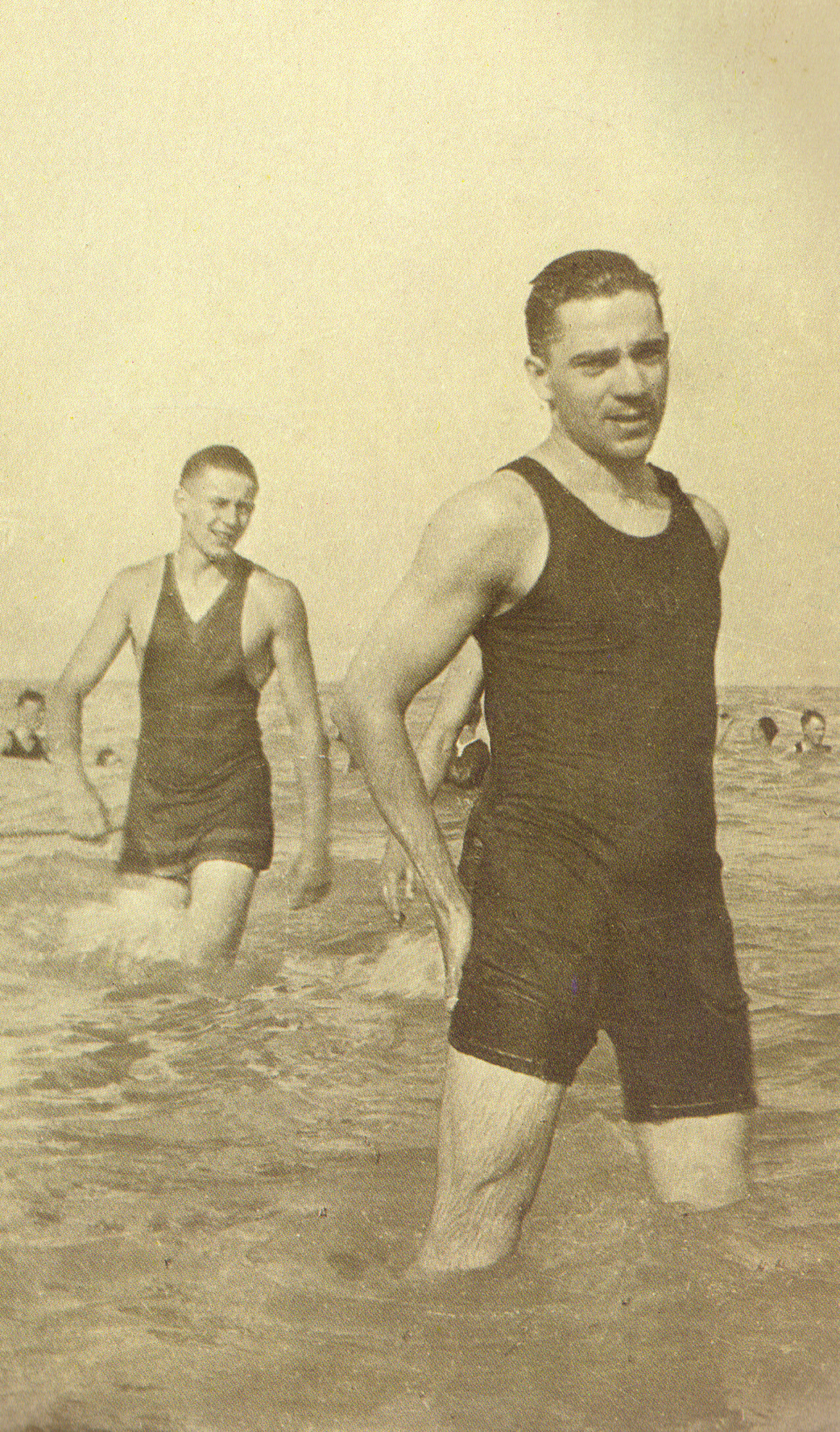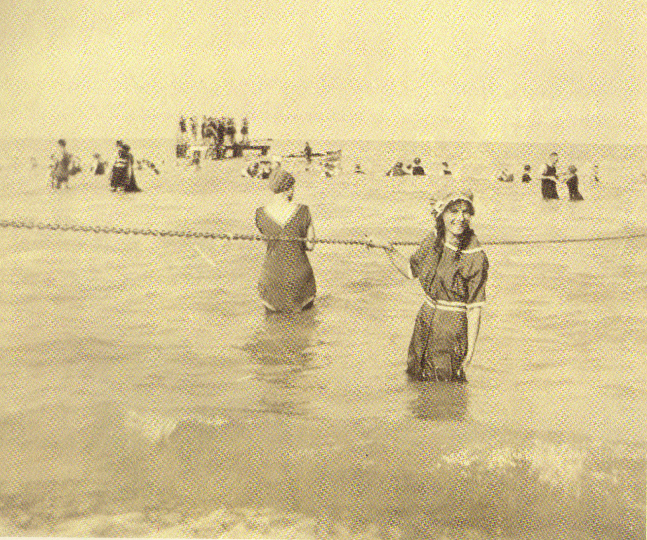 Readers will find this photo a fascinating study in the trends in swimwear. It would be better to label these garments bathing suits in the literal sense, as one could hardly swim effectively wearing them.