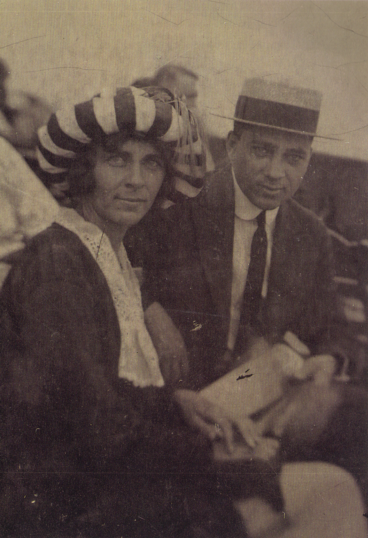 Loma Armstrong with her husband at a sporting event. The dress is typical of World War I period.