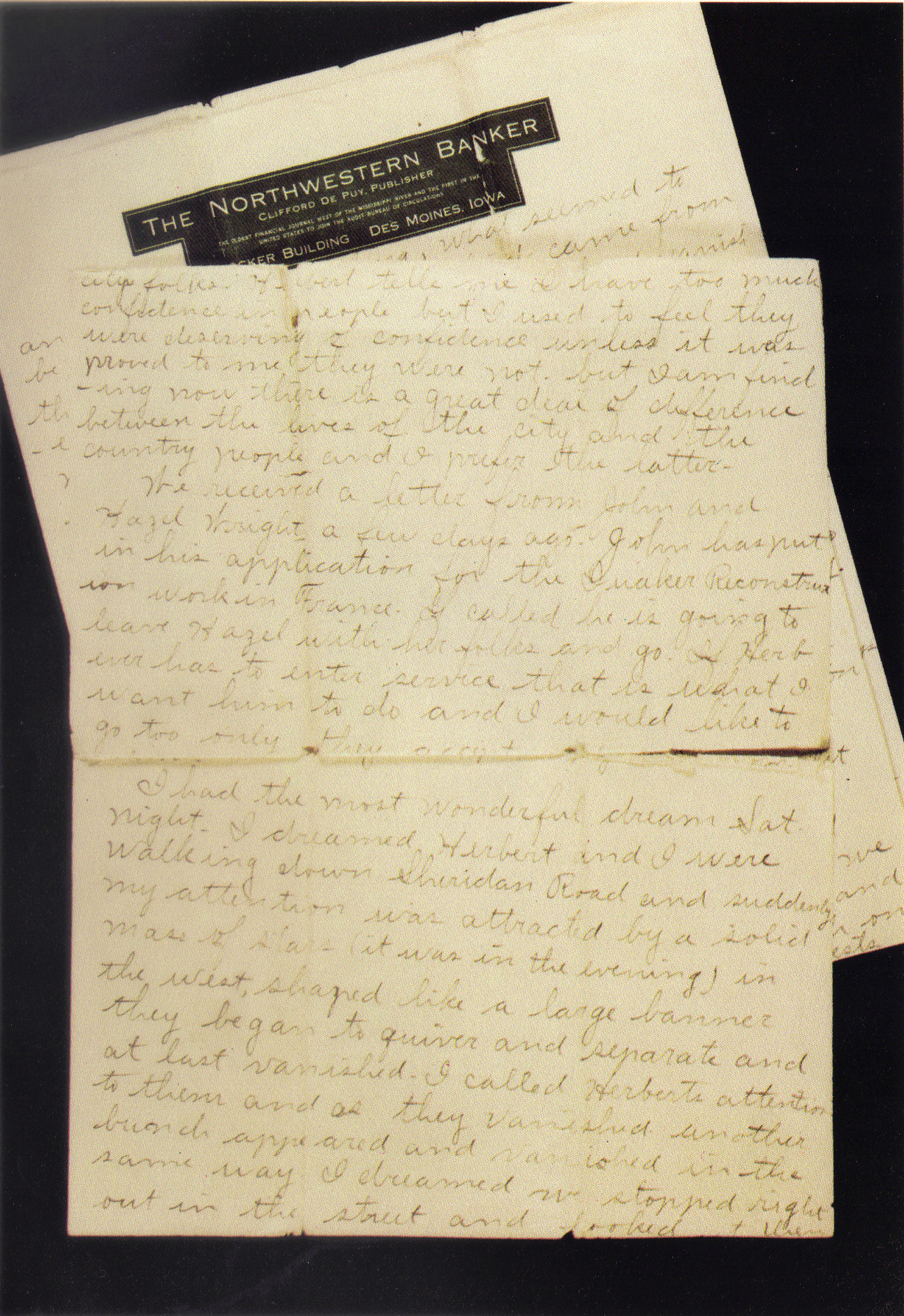 A reproduction of a letter from Mr. Armstrong to his mother written en route to Chicago July 23, 1917. Mr. armstrong expected to be drafted at any moment