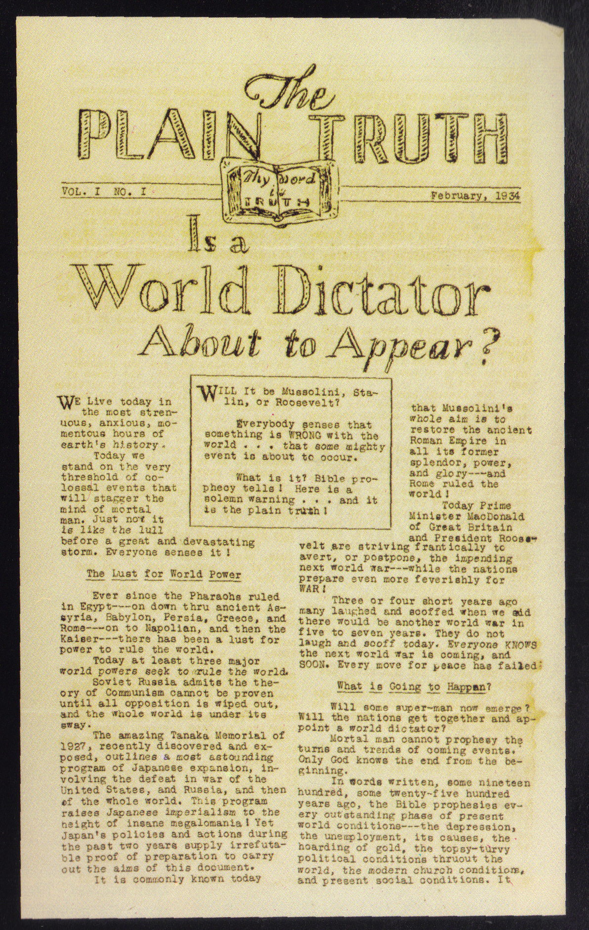 January 1, 1938, we finally were enabled to bring The Plain Truth back to life! It was the first issue in two and a half years!