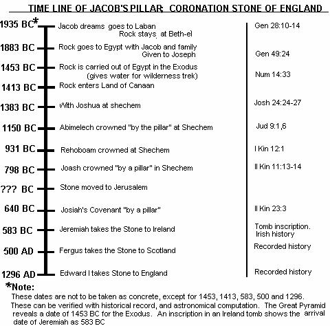 The Coronation Stone sits in Westminster Abbey, England, is the coronation stone of the Hebrew nation called Israelites. This stone was named Beth-el (house of God) by the patriarch Israel (sometimes called Jacob) roughly 2000 BC and remained with his descendents. It travelled with them for forty years in the wilderness, supplying their water, and was preserved and brought to Ireland in 583 BC by the prophet Jeremiah; eventually being transferred to Scotland, then England.