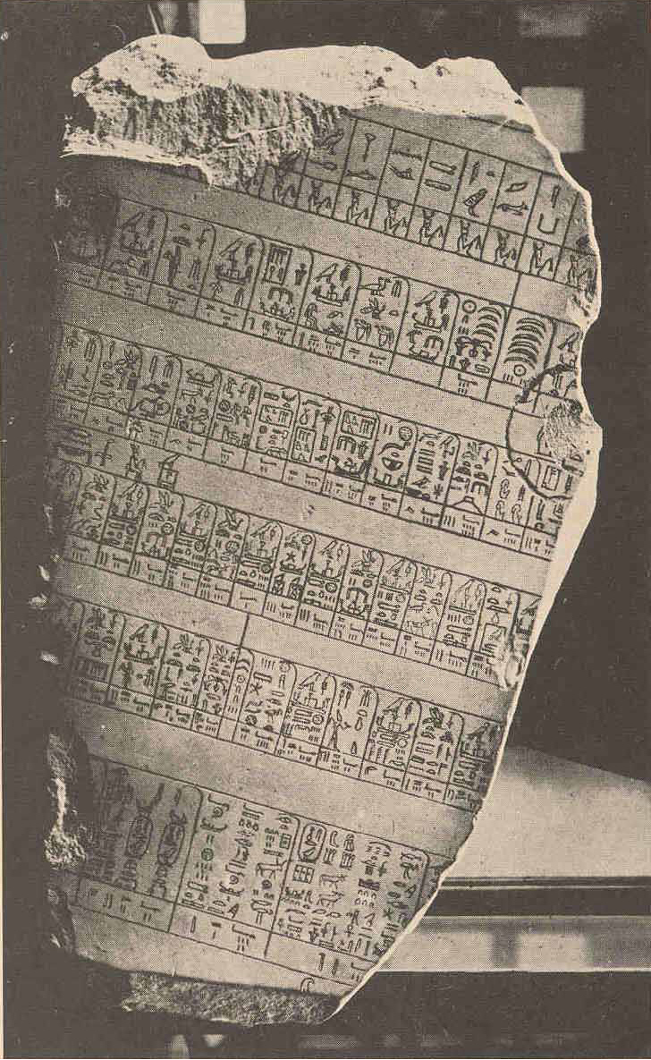 A cast of a fragment of the Palermo Stone. This inscription lists the kings of Abydos, Memphis and Elephantine- the first dynasties of Egypt- in successive order. Historians assumed with this arrangement that each ruler succeeded each other in consecutive order. It never seems to have occurred to them that the kings of each city were ruling in part contemporaneously, but that the scribes listed the cities successively in order of their relative importance as a matter. The forthcoming world history will explain what really happened in the ancient near east.